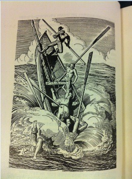 The illustration depicted is titled Whaleboat and Crew Tossed into the Sea and appears toward the end of the novel. The dual title pages, in English and Hebrew, are also shown here. And, it really does start the same way as the English version… “Call me Ishmael.”