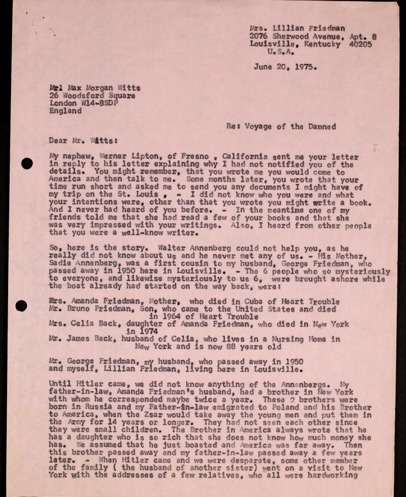 Letter from Lillian Friedman to Max Morgan Witts, June 20, 1975.