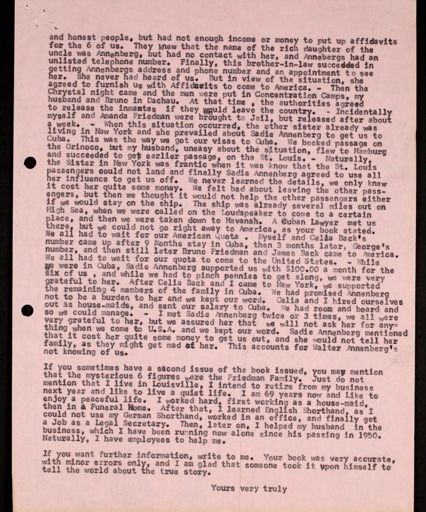In the case of St. Louis only 22 Jewish refugees were permitted ashore—mainly those who held valid U.S. visas. Lillian and Georg Friedmann were among the fortunate few. In a 1975 letter to author Max Morgan Witts, whose book Voyage of the Damned documented the tragedy, Lillian recounted how they had secured U.S. visas at the last dime thanks to the intervention of Georg’s cousin, Sadie Annenberg. Not only it “costs her quite some money” to get them out, but she also supported them during their months-long wait in Cuba before they continued on to the United States.