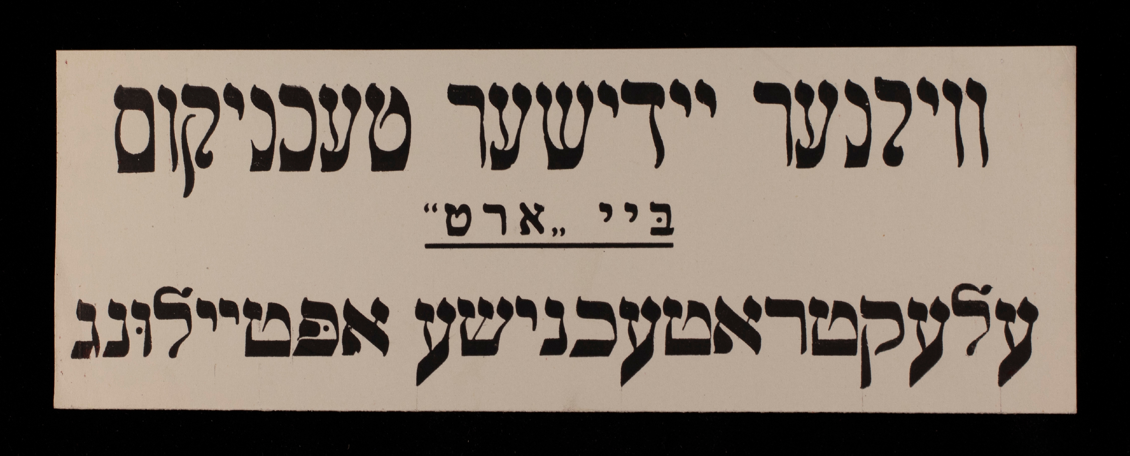 A placard reading “Vilner yidisher Technicum bay ORT: Electrical Engineering Department.” Photograph; miscellaneous placards, undated, Records of the ORT Vocational School (Technicum) in Vilna, RG 21, Box: 6, Folder: 93. Collection of YIVO Archives.