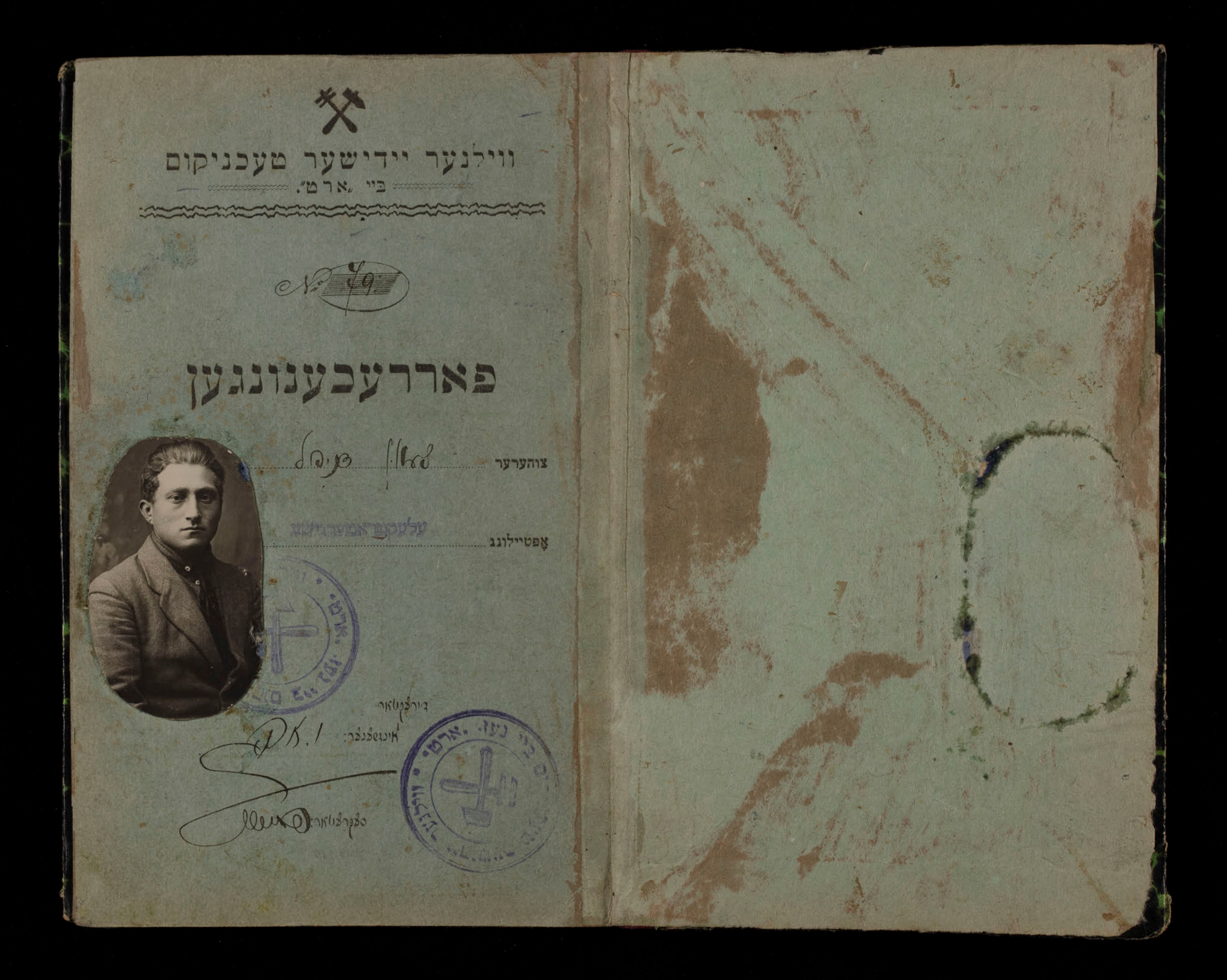 Student identification cards and booklets recording course credits. Records of the ORT Vocational School (Technicum) in Vilna, RG 21, Box 6, Folder 85. Collection of YIVO Archives.